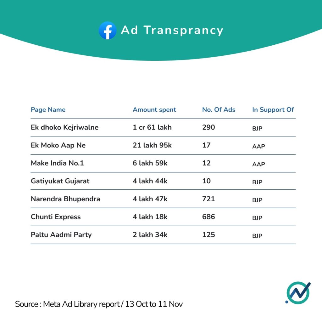 Statistics made available by Facebook show that the Aam Aadmi Party has been the top spender in the last month with a total ad spend of 39 lakhs for 35 advertisements. While the BJP, currently in power in Gujarat, spent only 19 lakh rupees- much less in comparison with the AAP – on 558 advertisements it ran from its official account. The Congress party meanwhile, also looking to strengthen its foothold in the state, ran 368 advertisements for a cost of 13 lakh rupees.