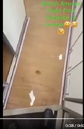 Several social media users are circulating a video of an extremely messy aircraft cabin with dirty toilets and toilet paper strewn around, claiming it to be of a British Airways flight from Pakistan to London.