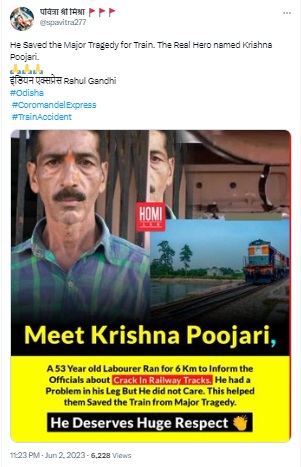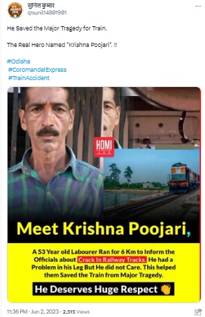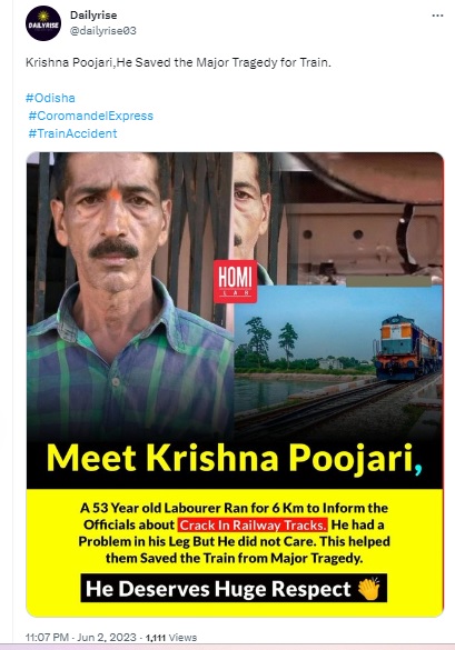 Soon after the shocking train tragedy in Odisha’s Balasore on June 2 that killed at least 261 people, several social media users are circulating a graphic showing a 53-year-old Krishna Poojari, a labourer, who purportedly ran 6km despite a leg ailment, to inform railway officials about a crack in the tracks, thus averting a major tragedy. Thanking Pujari for saving many lives, users are linking the graphic to the recent train accident.