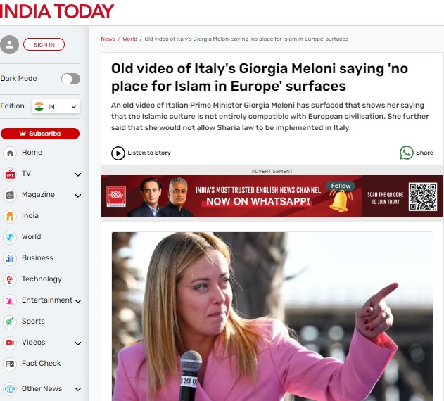 Newschecker ran a keyword search for “Giorgia Meloni Islamic culture”, which led us to multiple news reports, including NDTV, Times of India, Hindustan Times, and India Today, stating that a five-year-old video of Italy’s Prime Minister Giorgia Meloni has surfaced on social media, in which she said that Islamic culture and the values and rights of European civilisation have a “compatibility problem”.