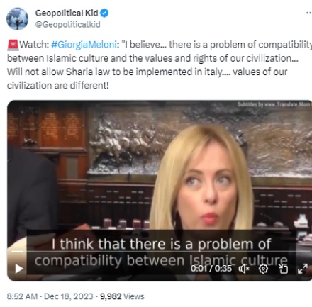Italian Prime Minister Giorgia Meloni saying there is a problem of compatibility between Islamic culture and the “values and rights of our civilization”.