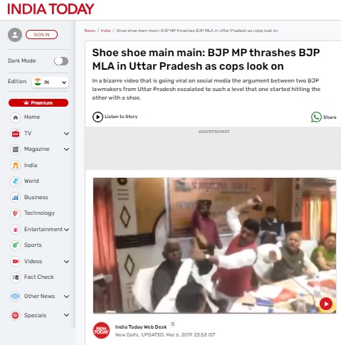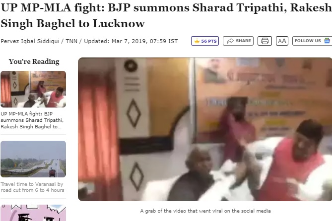 “BJP Lok Sabha MP from Sant Kabir Nagar Sharad Tripathi and party MLA from Mehdawal Rakesh Singh Baghel engaged in a fight during an official meeting in Uttar Pradesh on Wednesday. The video has gone viral on social media where Tripathi can be seen hitting Baghel with his shoe. The argument broke over the placement of names on a foundation stone of a project. Baghel hit back landing a few punches at the Lok Sabha MP before security personnel intervened and separated the two,” read an HT report, dated March 6, 2019.