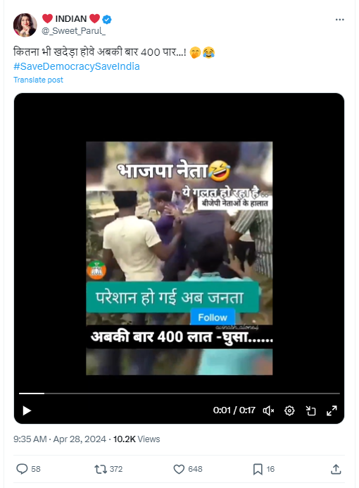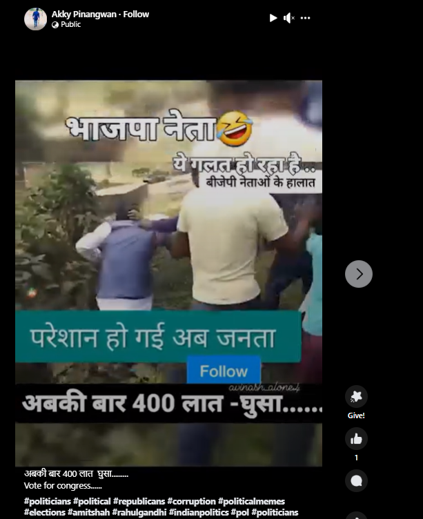 A video showing a mob manhaling a person and kicking him into a ditch has grabbed social media attention. Multiple social media users shared the footage claiming to show the “condition of the BJP leader.” The text overlay on the video reads, “BJP leader, this is wrong … This time 400 kicks-punches (translated from Hindi),” mocking the Bharatiya Janata Party’s slogan for Lok Sabha election campaign “Abhi Baar 400 Paar” (this time the party will win over 400 seats). Newschecker found that the video dates back to 2019, and shows an attack on a West Bengal BJP leader who joined the TMC in 2022.