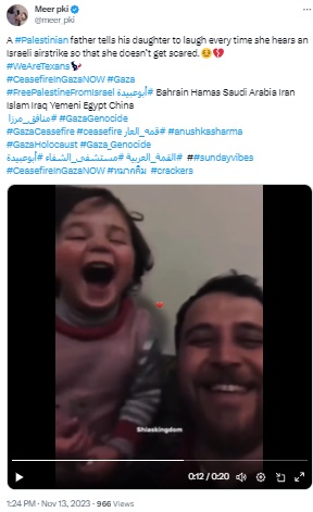 A relevant keyword search led us to this Youtube video, uploaded by Guardian News, dated February 18, 2020, stating, “In a video posted on social media, Abdullah Mohammad and his daughter Salwa, three, can be heard laughing at the sound of shelling in Syria. Mohammad, who moved his family from Idlib to Sarmada district, has tried to insulate his daughter from trauma by telling her the noise of bombs is part of a game. In September 2018, Turkey and Russia agreed to turn Idlib into a de-escalation zone in which acts of aggression are prohibited, but since then more than 1,800 civilians have been killed in attacks by the Assad regime and Russian forces.” Similar reports can be seen here, here and here, confirming that the viral video is not related to the ongoing Israel-Palestine conflict.