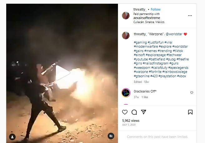 Newschecker ran a reverse image search of keyframes of the video, which led us to this Instagram post, dated July 5, 2020, uploaded by @threatty_, who described himself as a video creator. He has captioned the video, “Warzone!”, along with hashtags such as #gaming #justforfun #modernwarfare. @threatty stated that the post was a paid partnership with Airsoft Extreme, internationally known as one of the oldest airsoft companies in the United States. Airsoft is a military simulation sport where players participate in mock combat with authentic military-style weapons and tactics.