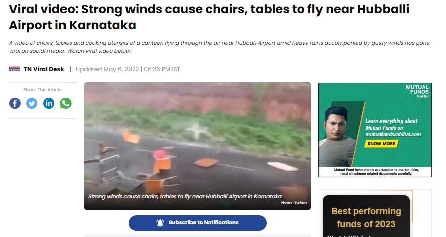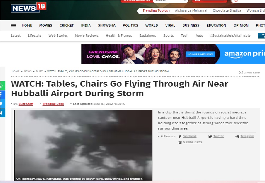 Taking a cue from this, we ran a relevant keyword search, which led us to multiple news reports about the incident, seen here and here. “A canteen near Hubballi Airport is having a hard time holding itself together as strong winds take over the surrounding area. Chairs, tables, and crockery can be seen flying as if they have lost all weight in them. On Thursday, May 5, Karnataka, was greeted by heavy rains, gusty winds, and thunder on top of it, reported Hubballi Times,” stated a News18 report, dated May 7, 2022. Hubbali Times uploaded a video on its Facebook page, confirming that the viral video is of the same incident.
