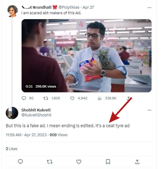 We skimmed through the comment sections of various posts carrying the viral footage and found a user pointing out that the clip is made by editing a CEAT tyres advertisement.