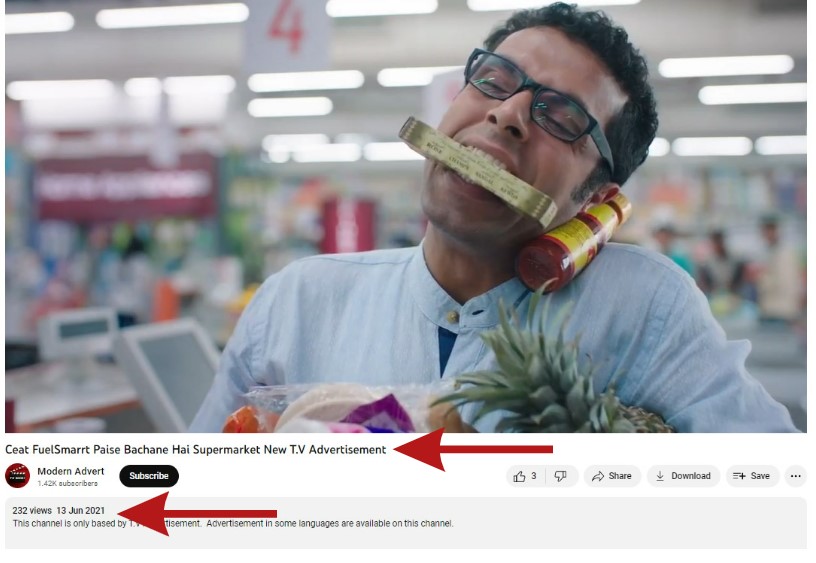 Taking a clue, we looked up keywords “CEAT Tyre Ads,” with the punchline “Paise Bachane Hai?” on YouTube. This yielded a video by Modern Advert, dated June 13, 2021, titled “Ceat FuelSmarrt Paise Bachane Hai Supermarket New T.V Advertisement.”