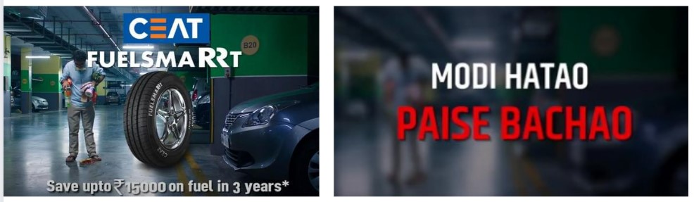 While in the end frames of the viral video a blurred background with “Modi Hatao” overlay is seen, the text element in the original advertisement reads, “CEAT FUELSMARRT … Save upto ₹ 15000 in fuel in 3 years*”