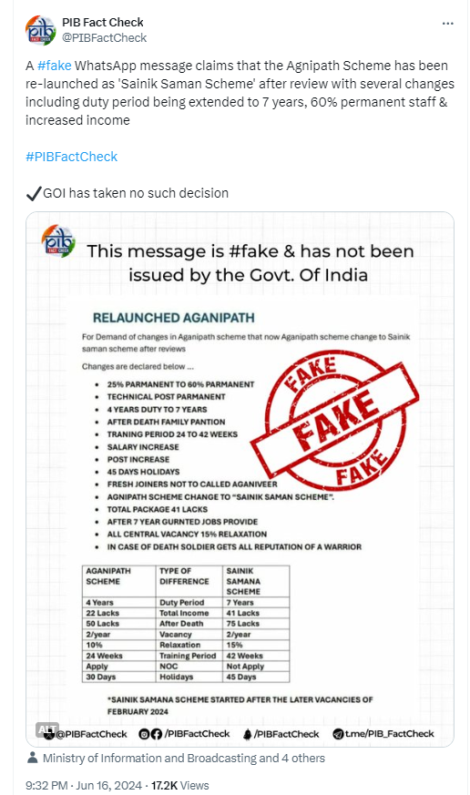 Furthermore, the government’s PIB Fact Check too termed the viral document as “fake.” In an X post, dated June 16, 2024, it stated, “A #fake WhatsApp message claims that the Agnipath Scheme has been re-launched as ‘Sainik Saman Scheme’ after review with several changes including duty period being extended to 7 years, 60% permanent staff & increased income. GOI has taken no such decision”