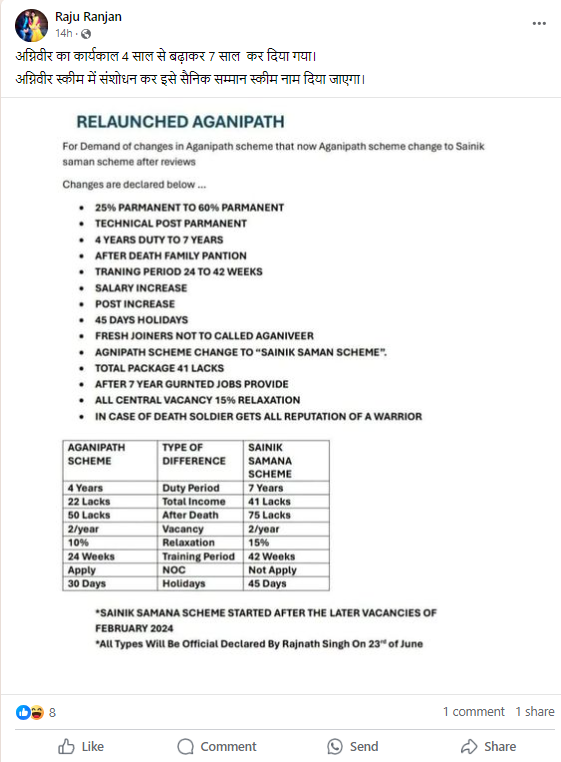 Several social media users shared a document purportedly announcing the “relaunch” of Agnipath scheme for the recruitment to the Indian armed forces by the newly sworn-in Modi government. The document further claims that amid rampant demands of changes in the scheme, “Aganipath scheme change to Sainik saman scheme after reviews (sic)”