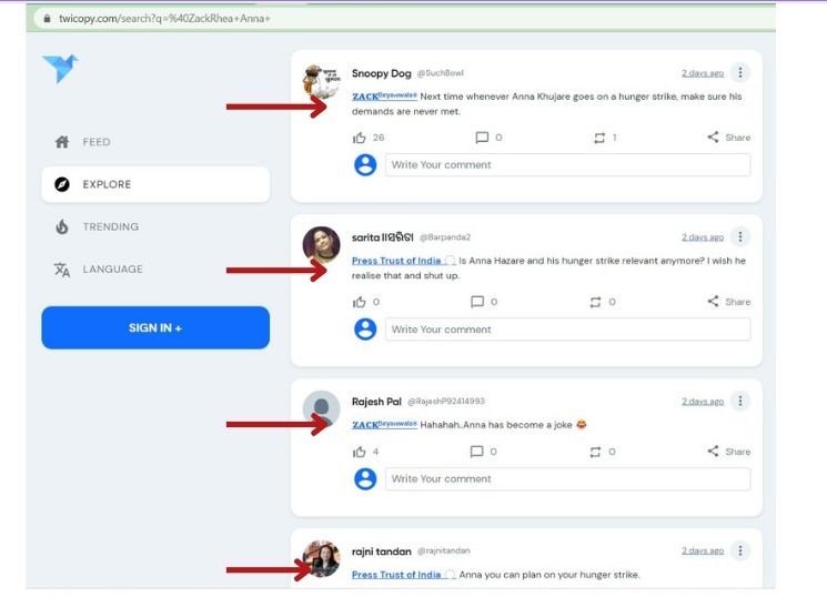 We looked up keywords “@ZackRhea Anna” and found several replies to a tweet by the username “Press Trust of India.”