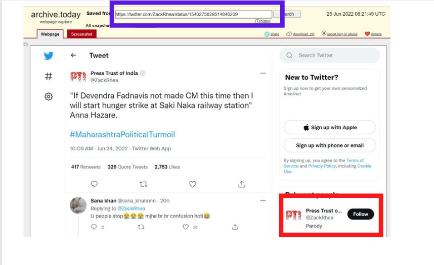 The search for the link to @ZackRhea’s tweet on archive.today web capture website yielded the tweet posted under the username of Press Trust of India claiming that Anna Hazare extended his support to Fandavis. Notably, @ZackRhea was also identified as “Parody” in the archived version of the tweet.