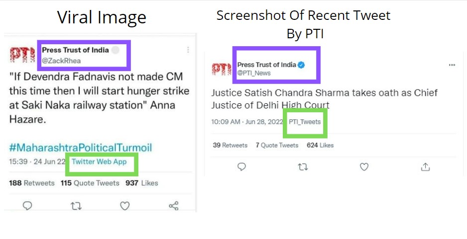 Several social media users shared the image believing that the tweet was made by news agency Press Trust of India and that Hazare had in reality extended his support to Fadnavis.