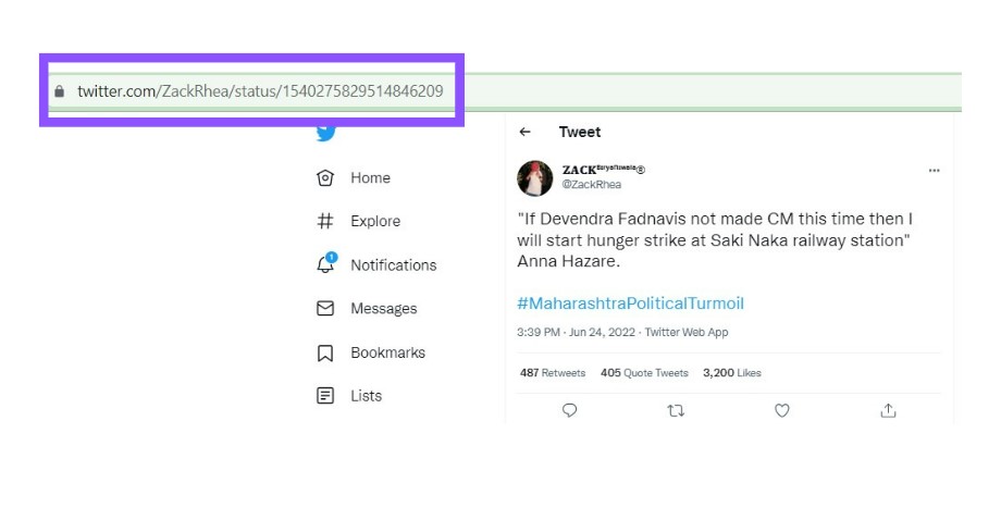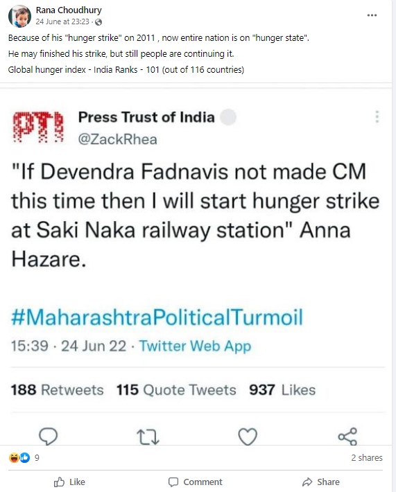 Amid the Maharashtra political crisis, an alleged tweet by “Press Trust of India” is going viral on social media platforms. The tweet claims that social activist Anna Hazare said, “If Devendra Fadnavis not made CM this time then I will start hunger strike at Saki Naka railway station.”