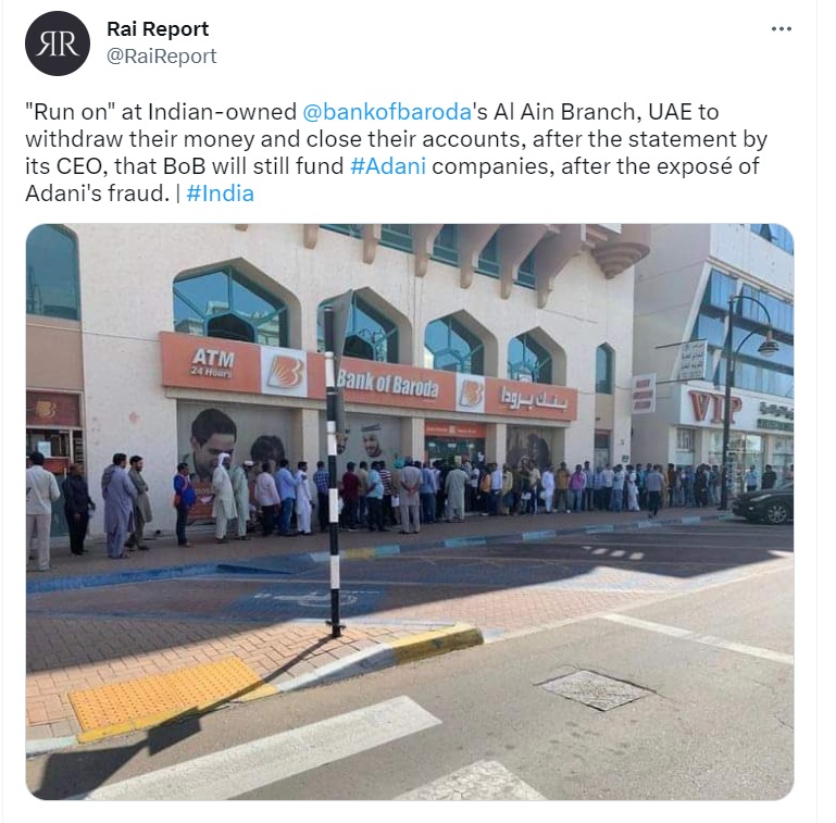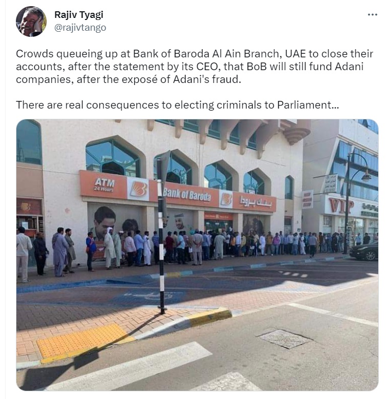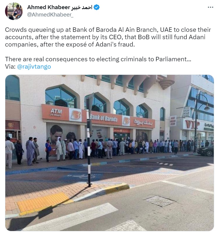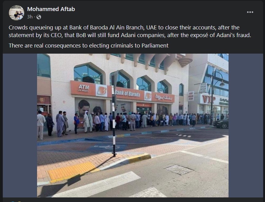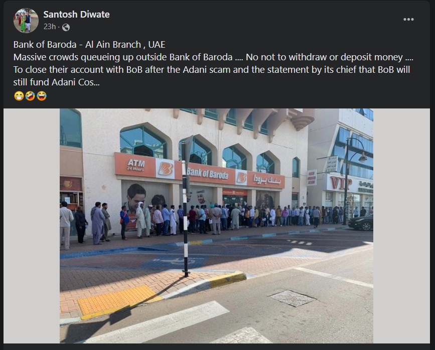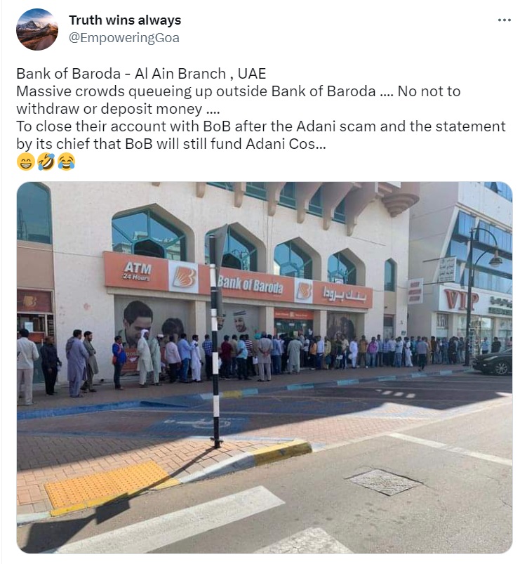“Bank of Baroda- Al Ain Branch, UAE Massive crowds queueing up outside Bank of Baroda. No not to withdraw or deposit money. To close their account with BoB after the Adani scam and the statement by its chief that BoB will still fund Adani Cos,” the caption being shared with the image reads.