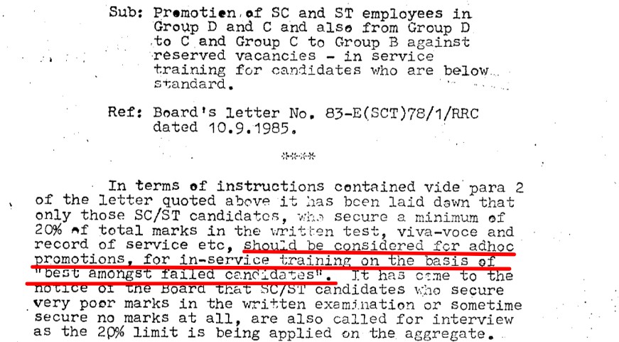 Further, using the details mentioned in the document, we dug out the Railway Board’s letter numbered 88-E(SCT)1/23/1. The letter, dated May 8, 1989, stated, “…it has been laid down that only those SC/ST candidates, who secure a minimum of 20% of total marks in the written test, viva-voce and record of service etc, should be considered for adhoc promotions, for in-service training on the basis of best amongst failed candidates.”
