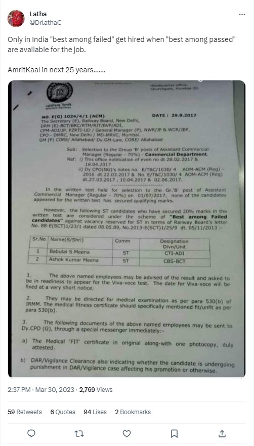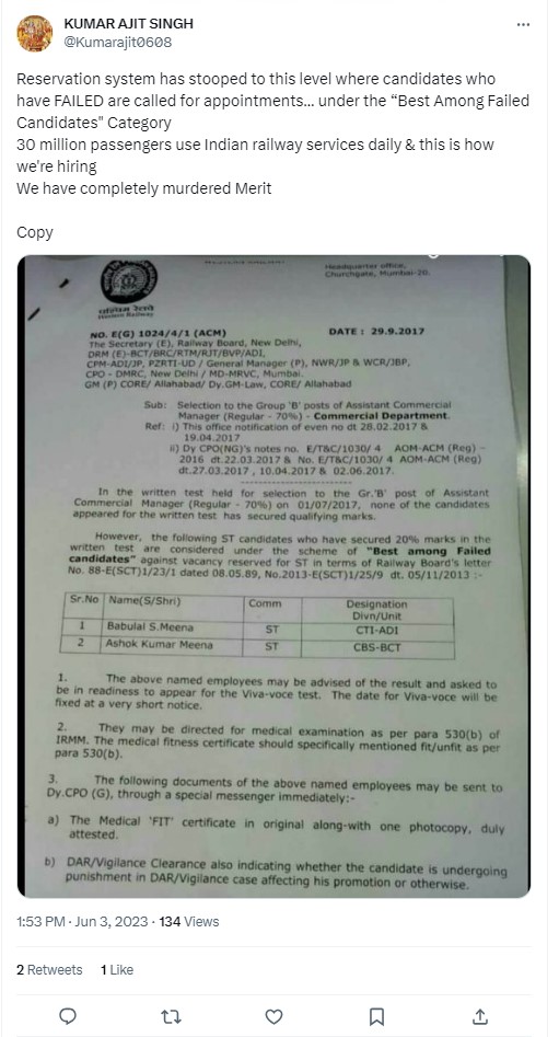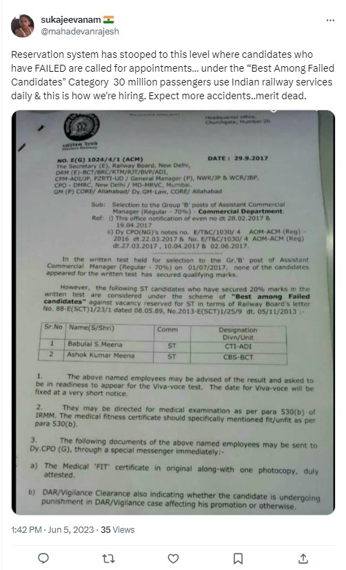We found that the “best among failed candidates policy” is indeed something which is followed in the railways. However, it is used for only internal promotion and that too in the “non-safety” category – which are said to be non-vital for train operations and not new hirings. Candidates are promoted on an ad hoc basis, and their performance is reviewed in six months. The viral image is being shared out of context.