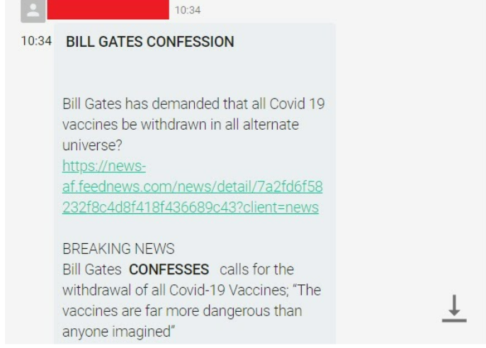 The claim about Bill Gates calling for the roll back of the vaccines has recently made its way onto WhatsApp via another website ‘www.news-af.feednews.com‘.