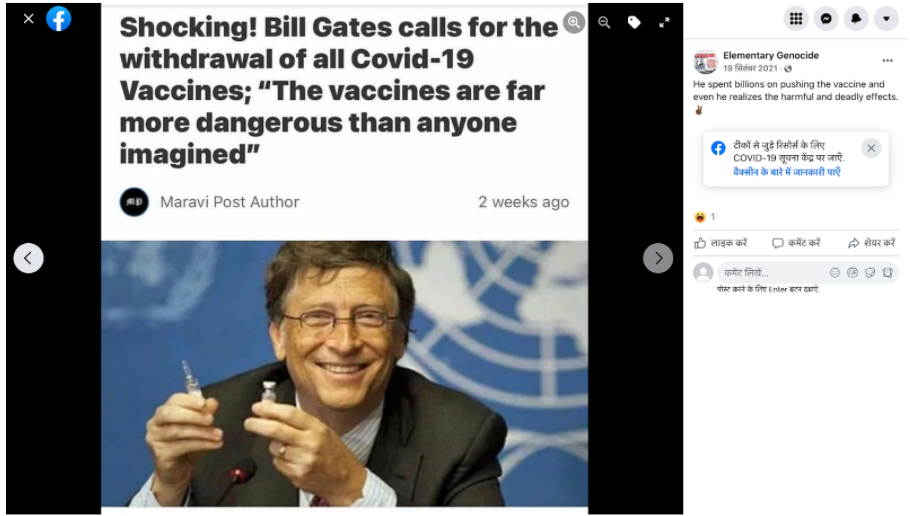 The same claim was found to be doing rounds on social media platforms Facebook and Twitter since September 2021. These posts were accompanied by screenshots or the link to an article by the website ‘The Exposé’ and website ‘maravipost.com’. Based on the headline and content of the article by the latter website, it can be seen that the article is based on the piece published by ‘The Exposé’.