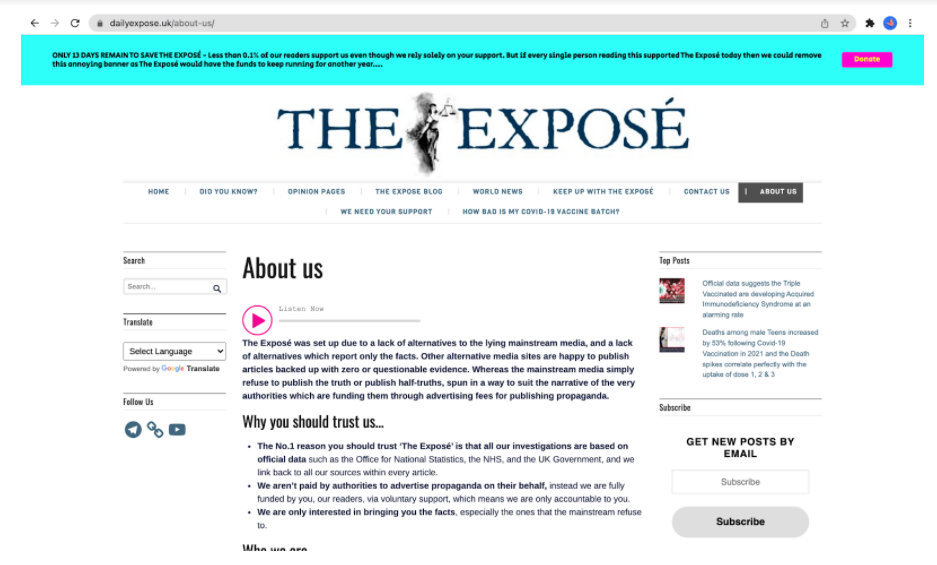 “The Exposé was set up due to a lack of alternatives to the lying mainstream media, and a lack of alternatives which report only the facts.” reads the about section of the website ‘The ‘Exposé’.