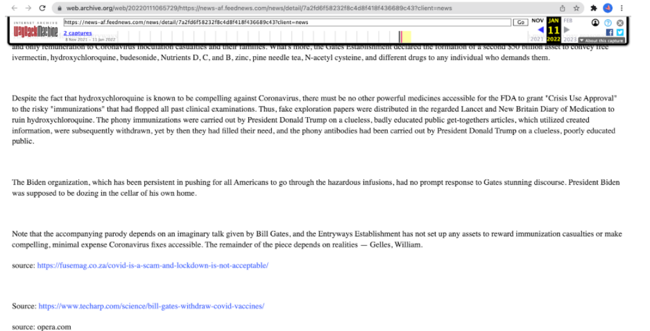 The article by ‘www.news-af.feednews.com’ has a foot note that reads “Note that the accompanying parody depends on an imaginary talk given by Bill Gates, and the Entryways Establishment has not set up any assets to reward immunization casualties or make compelling, minimal expense Coronavirus fixes accessible. The remainder of the piece depends on realities — Gelles, William.”