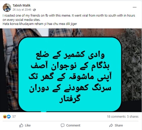 We continued our investigation to decipher the origins of this news and conducted keyword searches for “Budgam Youth Tunnel Girlfriend,” “Budgam Youth Tunnel”, “Budgam Youth Arrested” on Facebook and Twitter. One such keyword search on Facebook led us to a post by user @ashiq.khan.16144, dated July 26, 2022. It carried a screenshot of another Facebook post stating “I roasted one of my friends on FB with this meme. It went viral from north to south within hours on every social media site. Hata korwa khudayam reham yi haa chu mea dili jiger (May God’s peace be upon you. He is my heart.),” and featured an image of some text written in Urdu.”
