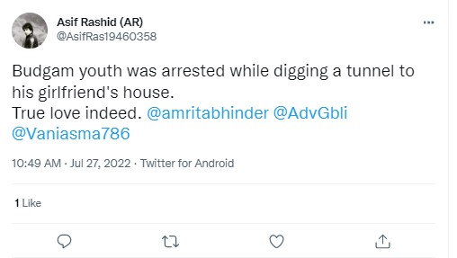 The text in Urdu translates to “A youth Asif from Budgam Kashmir was arrested while digging a tunnel to his girlfriend’s house,” -confirmed our Kashmiri team.