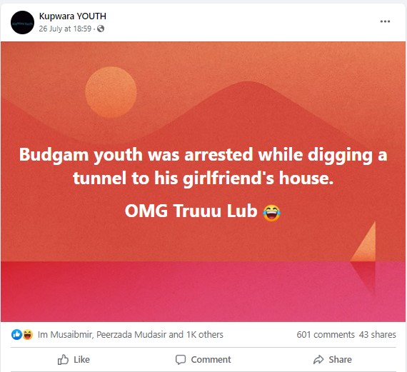 An alleged incident from Kashmir opened discussions about “true love” and a comic fest on social media platforms. Several Facebook and Twitter users claimed that a Budgam youth was arrested while digging a tunnel to his girlfriend’s house, but Newschecker has found that the viral claim is false.