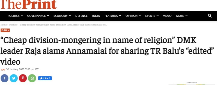 We then came across this Indian Express news report, dated January 31, 2023, titled “TN BJP chief Annamalai shares edited clip of DMK MP Baalu’s remarks on ‘temple demolition’, draws flak”. According to the report, K Annamalai, chief of the Tamil Nadu unit of the BJP, shared an edited clip of Baalu’s speech at an event in Madurai and alleged that DMK members take pride in demolishing 100-year-old Hindu temples. The article stated many DMK supporters on social media noted that the clip was edited and shared a longer version of the speech made by Baalu in support of the Sethusamudram Ship Canal Project.