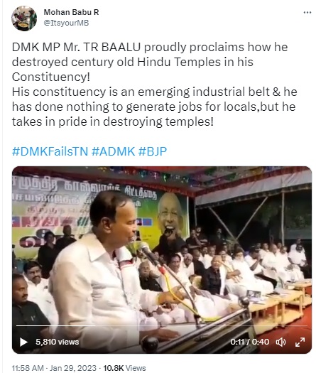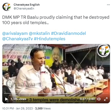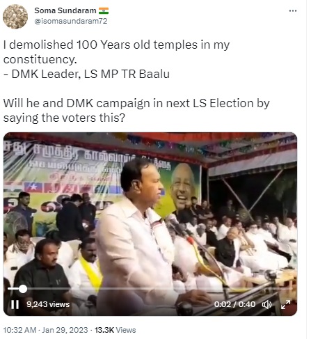 Several social media users, including verified Twitter handles, are sharing a video, where Tamil Nadu’s DMK MP TR Baalu is addressing a political rally, purportedly boasting that he has demolished 100-year-old temples.