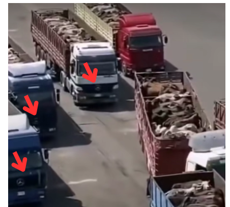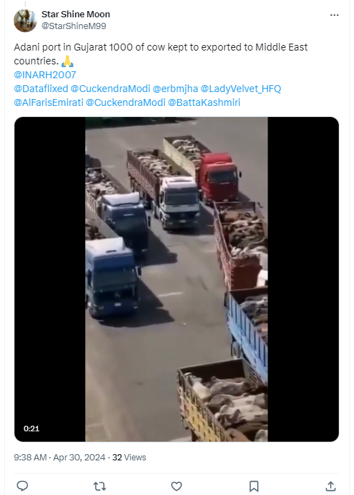 Video shows multiple trucks loaded with cows at Adani port for export.