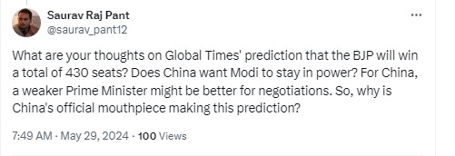 Several social media users are claiming that China’s national English-language newspaper, Global Times, has predicted a landslide victory of 430 seats for the BJP in the ongoing Lok Sabha elections for 543 constituencies, the results of which will be announced on June 4.