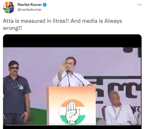 Congress MP Rahul Gandhi, while addressing the party’s “Halla Bol” rally targeting price rise, at Ramlila Maidan in New Delhi , attacked the Centre on the issue of price rise. He said the price of atta (wheat flour) rose from ₹22 per litre in 2014 to ₹40 per litre now. Several Twitter users, including some verified accounts, began to circulate videos of the gaffe, poking fun at the usage of his use of the word litre instead of kilograms.