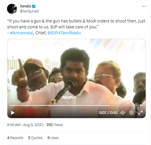 A video of Tamil Nadu BJP Chief K Annamalai allegedly saying,” If you have a gun, and the gun has bullets, and Modi orders to shoot then just shoot and come to us. The BJP will take care of you,” during a public address, has gone viral on social media platforms. Multiple users shared the ten-second-long-video calling out and criticising the Tamil Nadu State BJP President. Newschecker found that a clipped version of a longer footage has been shared out of context.