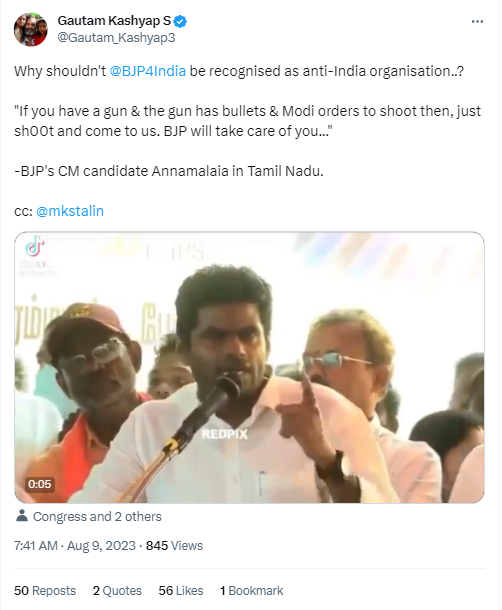 Tamil Nadu BJP Chief Annamalai makes inciting remarks, directs people with guns to “just shoot” on Modi’s orders.