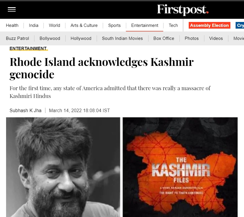 It is in this context that the director of the movie, Vivek Agnihotri tweeted a citation from the State Rhode Island, congratulating him for the release of the film, with the claim “HISTORIC: First time in 32 years, any state in the world, the democratic & liberal state of USA -Rhode Island, has officially recognised Kashmir Genocide due to a very small film. Pl read this and decide who is the persecutor and who should get the punishment. This is #NewIndia”