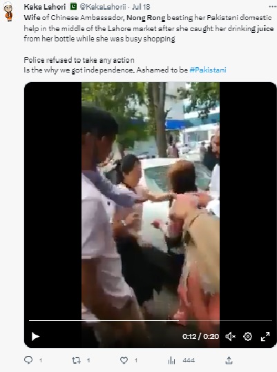 Several social media users are circulating a video, claiming it shows the wife of Chinese ambassador, Nong Rong, beating her Pakistani domestic help in the middle of the Lahore market after she was caught drinking juice from the ambassador’s wife’s bottle, while she was busy shopping.