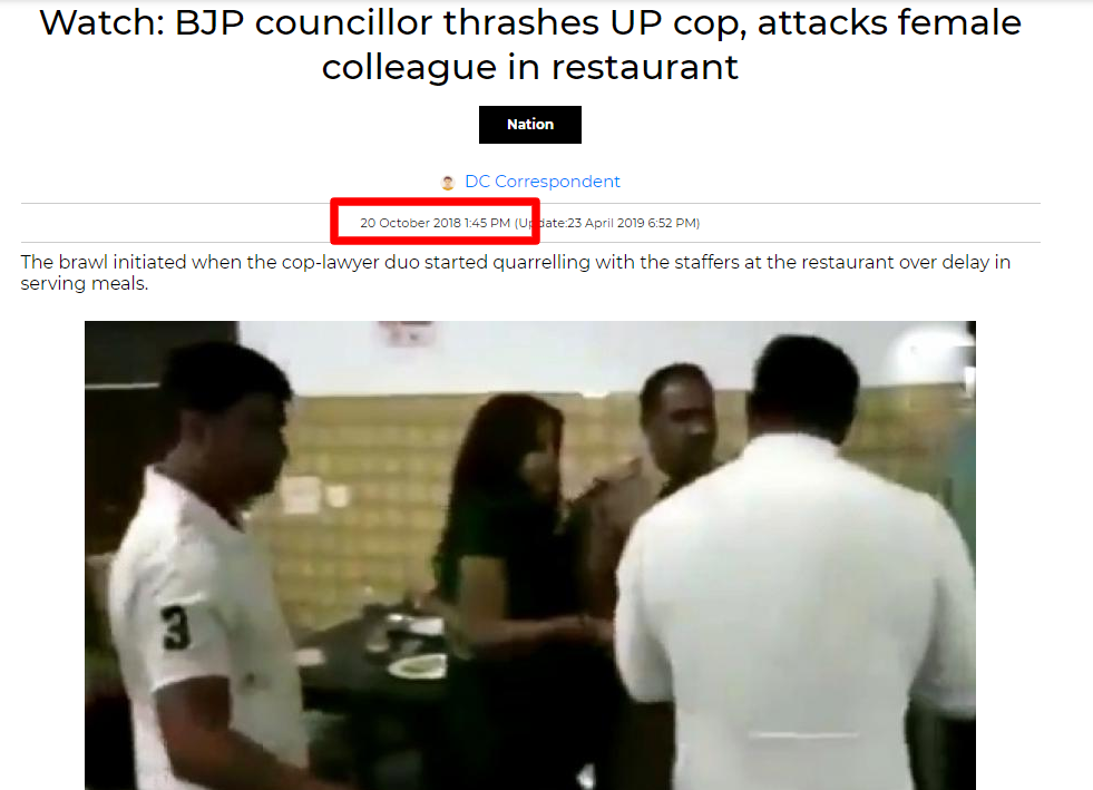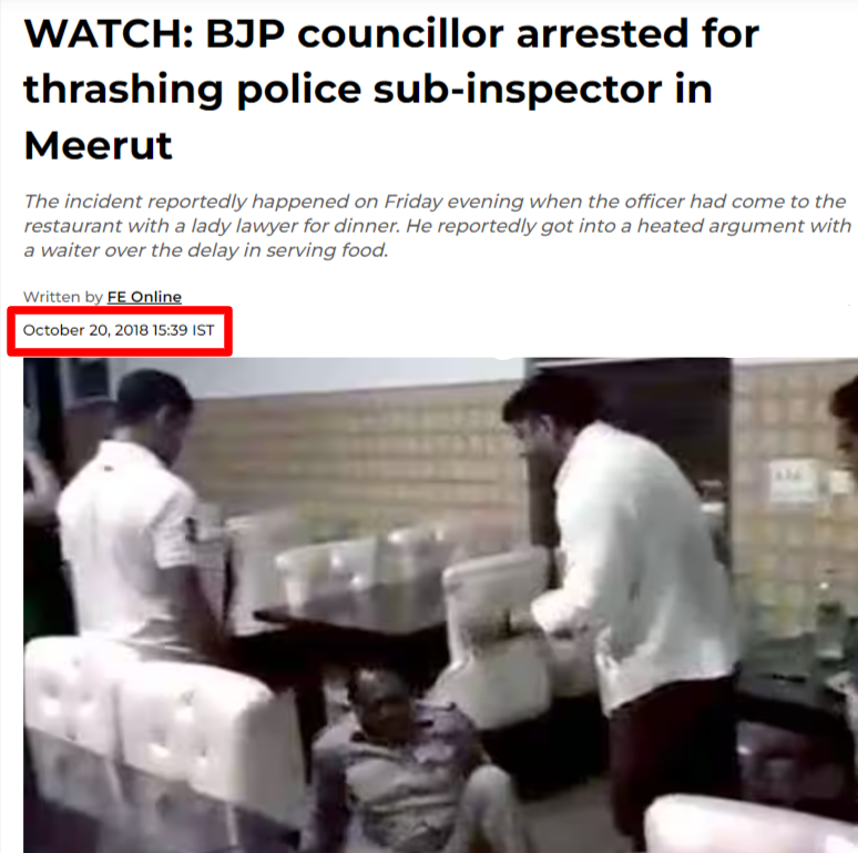 Following this, we conducted a Google lens search on the keyframes of the viral video which led us to a report by Deccan Chronicle, dated October 20, 2018. Displaying a screengrab from the viral footage, the report stated, “A sub-inspector, accompanying a female lawyer friend to a restaurant, was thrashed by its owner Munish Kumar, who is also a BJP councillor from Meerut’s ward no. 40 has, following altercation over delay in serving food.”