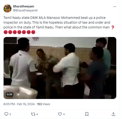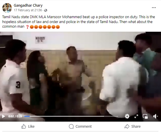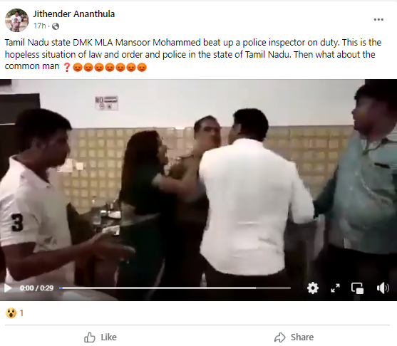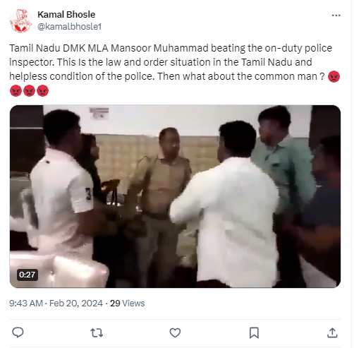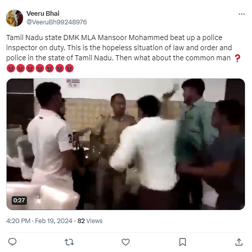 Multiple Facebook and X users shared the video claiming, “Tamil Nadu state DMK MLA Mansoor Mohammed beat up a police inspector on duty. This is the hopeless situation of law and order and police in the state of Tamil Nadu. Then what about the common man.”