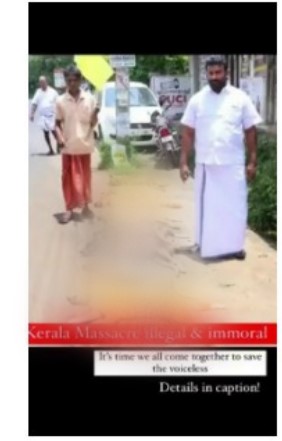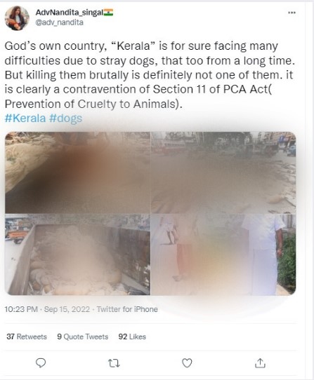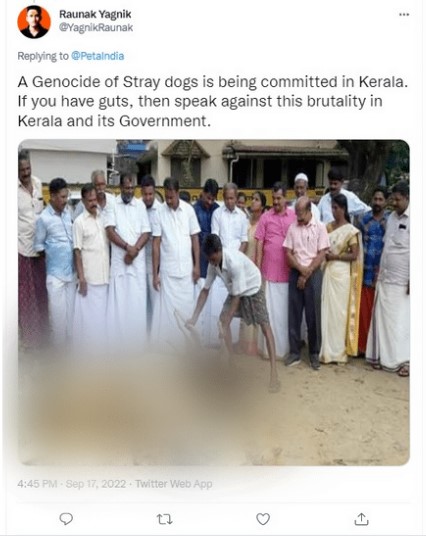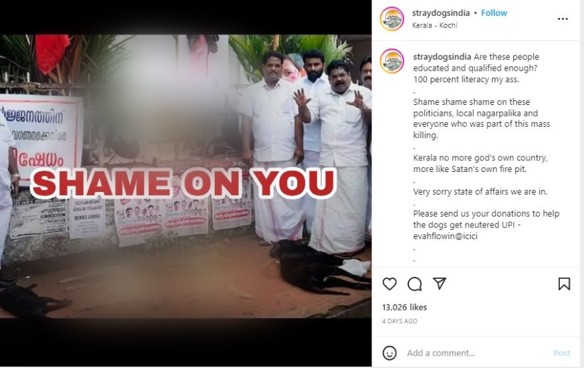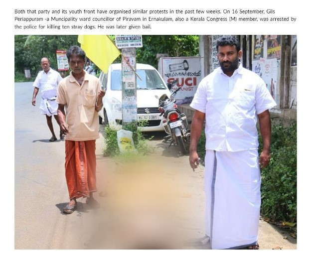 The viral photograph was captioned, “Gils Periappuram posing with the culled dogs.” The report added, “On 16 September, Gils Periappuram -a Municipality ward councillor of Piravam in Ernakulam, also a Kerala Congress (M) member, was arrested by the police for killing ten stray dogs. He was later given bail. “
