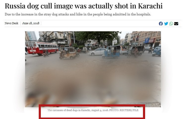 A quick Google reverse image search on the viral photograph led us to a report by The Express Tribune, dated June 18, 2018, titled ‘Russia dog cull image was actually shot in Karachi.’ The report carried the viral image with the caption “The carcasses of dead dogs in Karachi, August 4, 2016,” and was credited to Reuters.