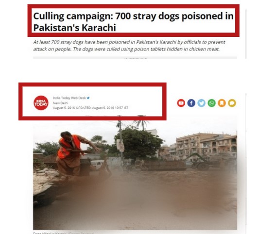 Further Google reverse image search with keywords “Karachi”, “Dogs,” “Municipality worker,” led us to an India Today report, dated August 6, 2016, titled ‘Culling campaign: 700 stray dogs poisoned in Pakistan’s Karachi.’ Displaying the image featured in Alamy, the report stated, “Officials estimate that at least 700 dogs have been poisoned and killed after the number of stray dog attacks in Karachi went up. The dogs were culled using poison tablets hidden in chicken meat.”