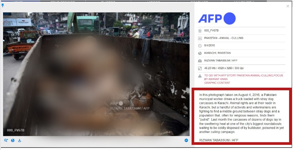 Furthermore, we found the image on AFP Forum with the caption stating, “In this photograph taken on August 4, 2016, a Pakistani municipal worker drives a truck loaded with stray dog carcasses in Karachi…