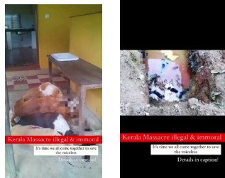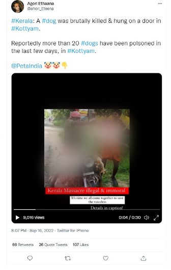 In addition to the above debunked images, a 29-second-long-slideshow of pictures featuring carcasses of stray dogs is also going viral on social media platforms. Several Twitter users shared the video with the caption, “#Kerala: A #dog was brutally kiIIed & hung on a door in #Kottyam. Reportedly more than 20 #dogs have been poisoned in the last few days, in #Kottyam.(sic)”