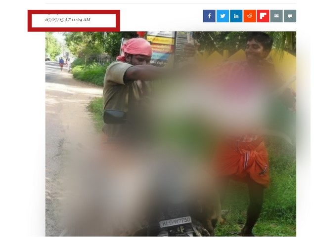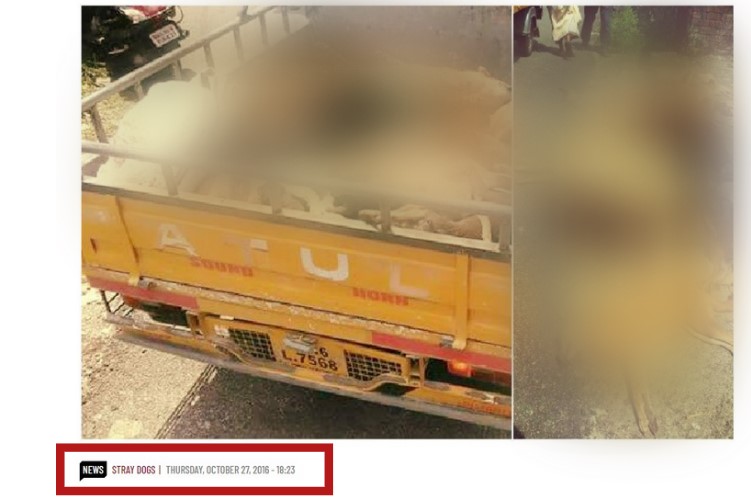 A September 2016 report by India Today featured the viral image with the caption ‘Members of the Kalady panchayat with the killed strays.’ Titled ‘No country for dogs: Shocking pictures of culling of strays emerge in Kerala,’ the article stated, “The dogs were found dead in the Kalady panchayat of Ernakulam on Wednesday. The pictures were taken and forwarded by the animal rights activists in the area.The police have registered a case against 17 members of the panchayat under The Prevention of Cruelty to Animals Act. The accused allegedly killed 22 strays in the panchayat.”