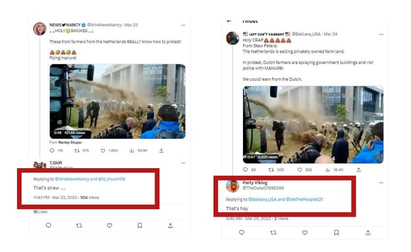 On scanning through the comment sections of posts carrying the viral footage, we noticed several users pointing out that the protesters were spraying “hay ” or “straw,” and not manure.