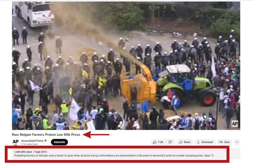 Further, a keyword search for “Farmers protest,” “Brussel,” “Hay,” on YouTube led us to a video by Associated Press, dated September 7, 2015. The description of the video read, “Protesting farmers on Monday used a tractor to spray straw at police during confrontations at a demonstration in Brussels to demand EU action to counter slumping prices.”