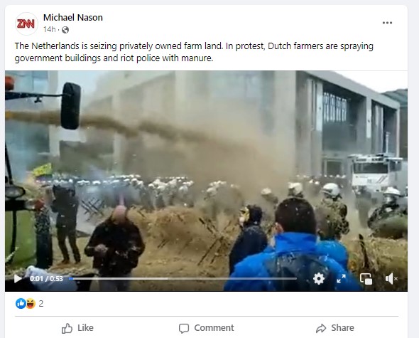 We could thus conclude that an old video from Brussels is falsely shared to show the Dutch farmers spraying government buildings with manure to protest against their decision.