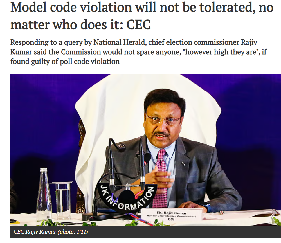 Furthermore, we found a report in the National Herald by Mathew, dated March 16, 2024, stating, “Responding to a question by National Herald, chief election commissioner (CEC) Rajiv Kumar said, “Wherever there’s a violation established, we will not sit back. We will take action – whosoever the person is, however high they are.”